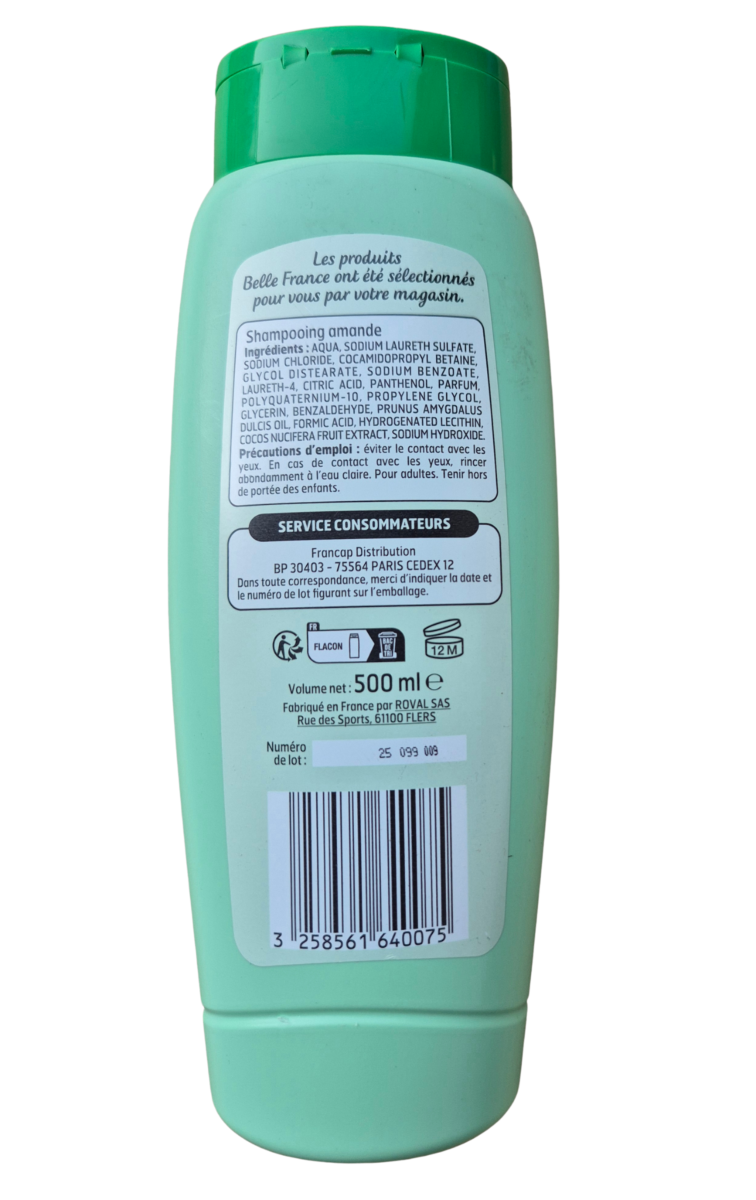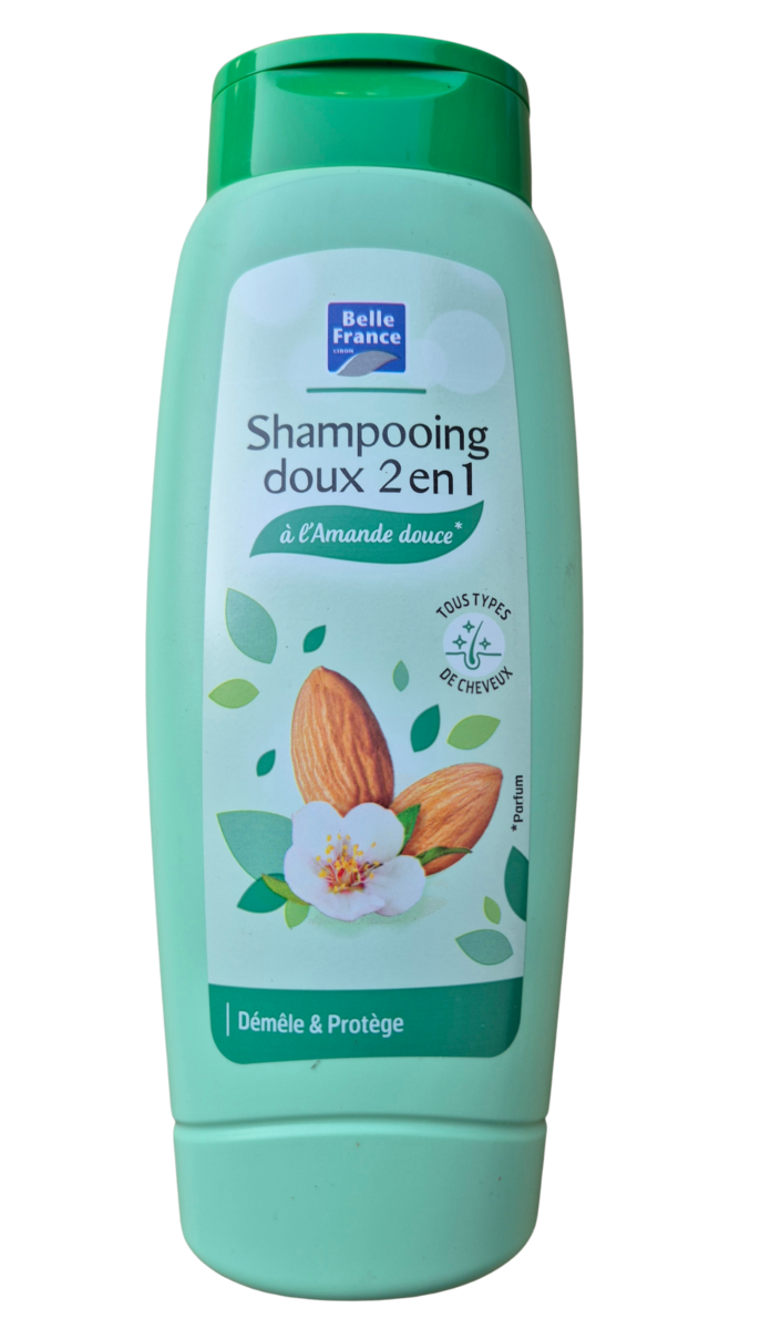 Shampoing doux 2 en 1 à l'amande douce, démêle et protège. 500 ml, 3,50 euros.