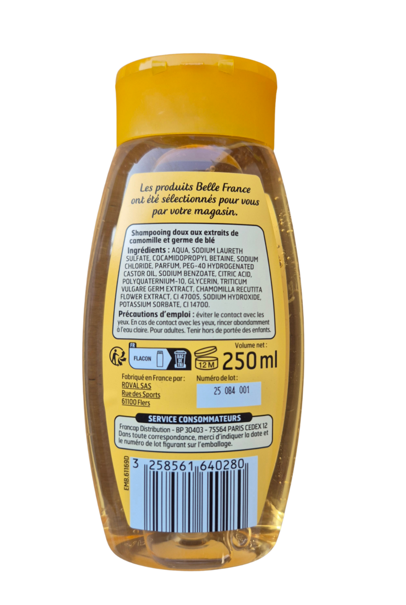 Shampoing doux, camomille et blé, illumine et adoucit, 250 ml, 2,70 euros.
