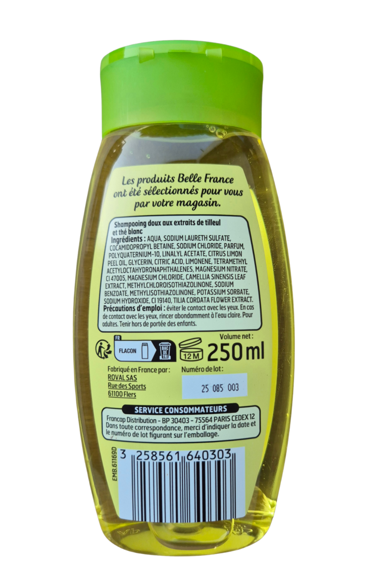 Shampoing doux, tilleul et thé blanc, douceur et vitalité, 250 ml, 2,70 euros.