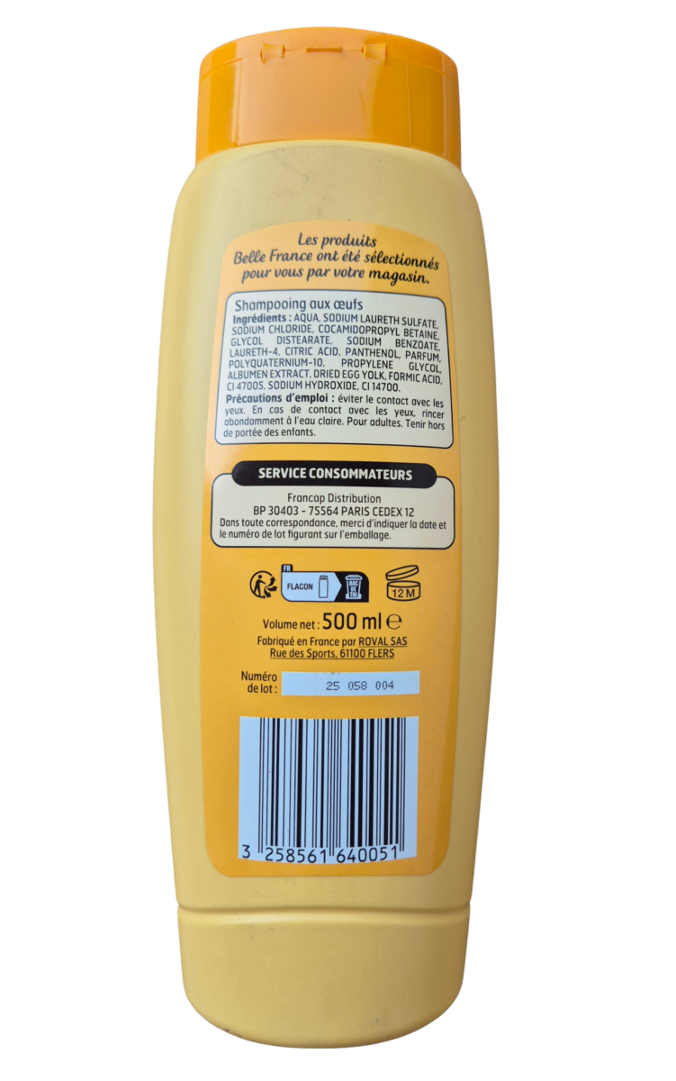 Shampoing fortifiant aux œufs, protège et fortifie,  500 ml, 3,50 euros.