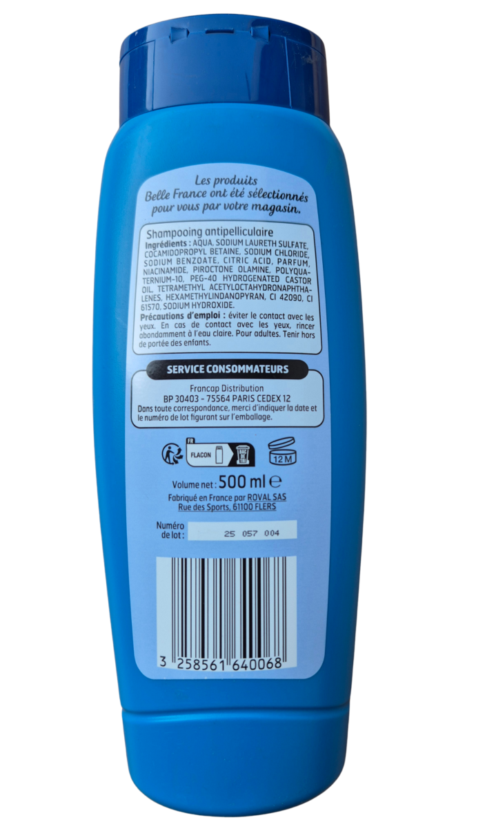 Shampoing purifiant, antipelliculaire, favorise l'élimination des pellicules, 500 ml, 3,50 euros.